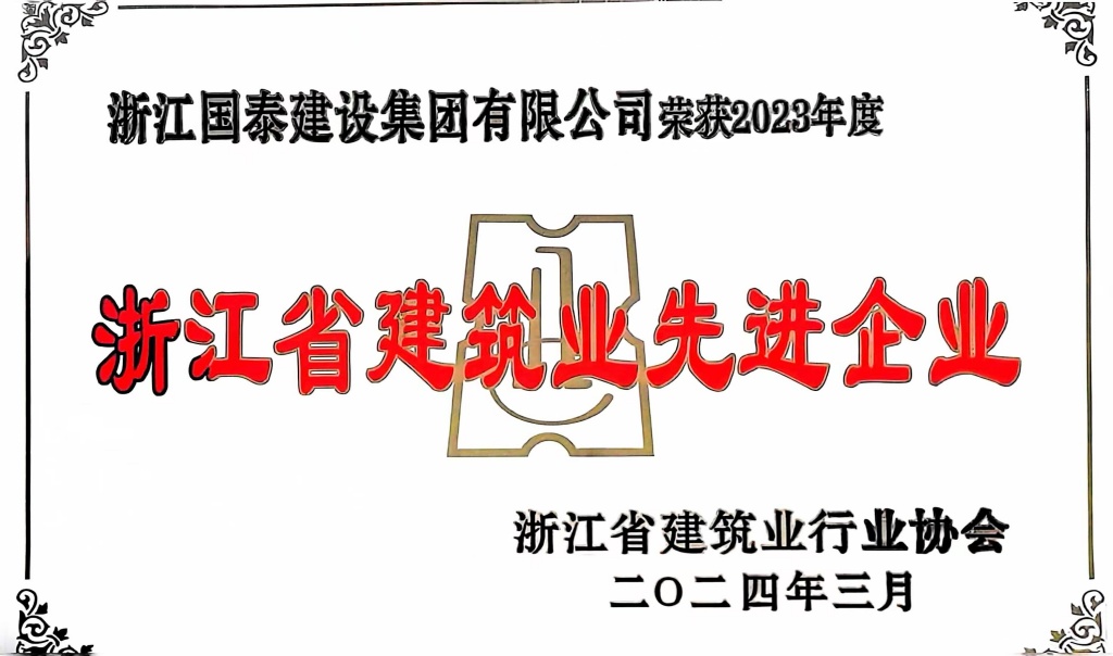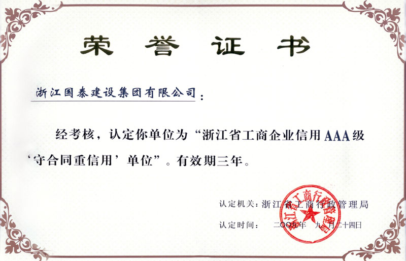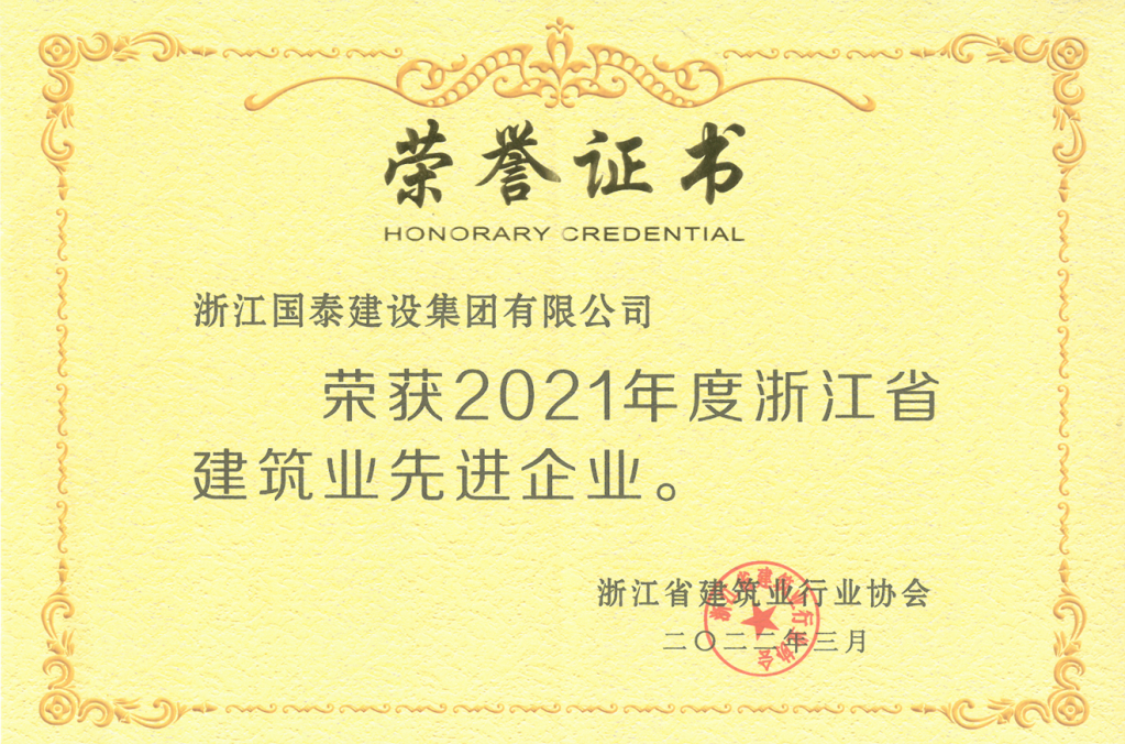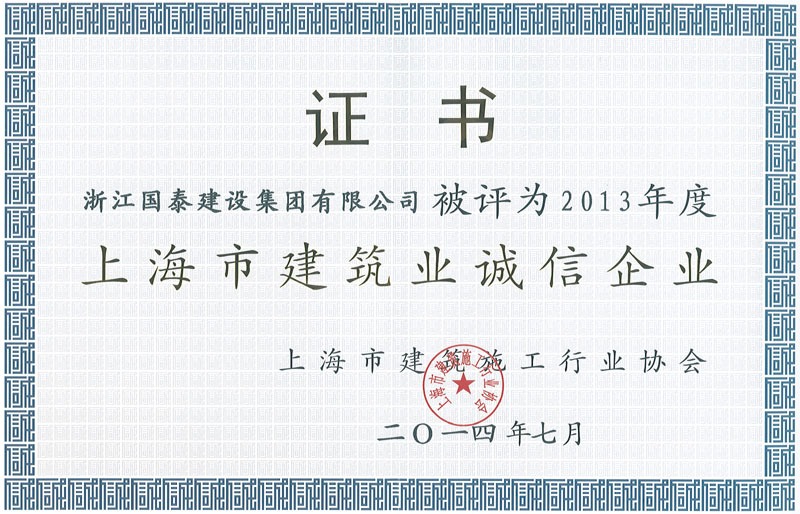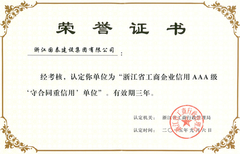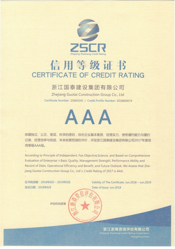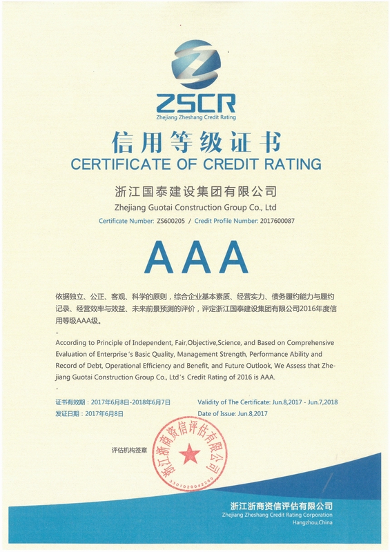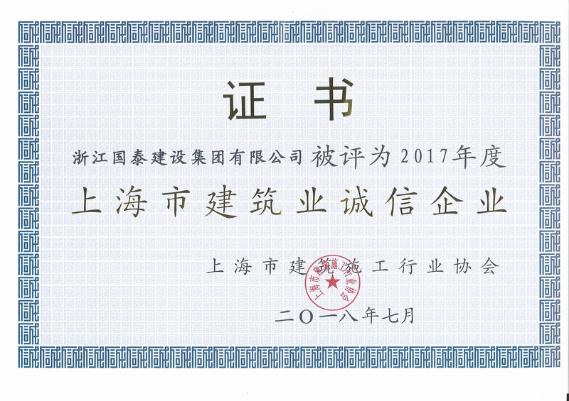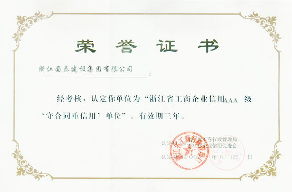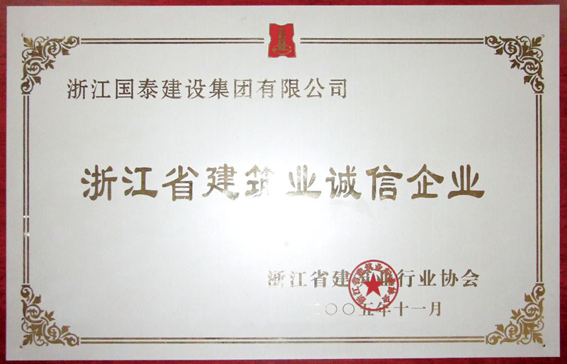 浙江省百强民营企业,浙江省建筑重点骨干企业,浙江省先进建筑施工企业,浙江省用户满意施工企业,浙江省首批诚信企业,杭州市百强企国泰产业、建设银行"AAA" 级信用企业,连续十八年被评为上海市外省市进沪施工企业工程质量、施工安全、经营行为、队伍管理、文明施工和科技进步等实绩综合考评优秀企业。