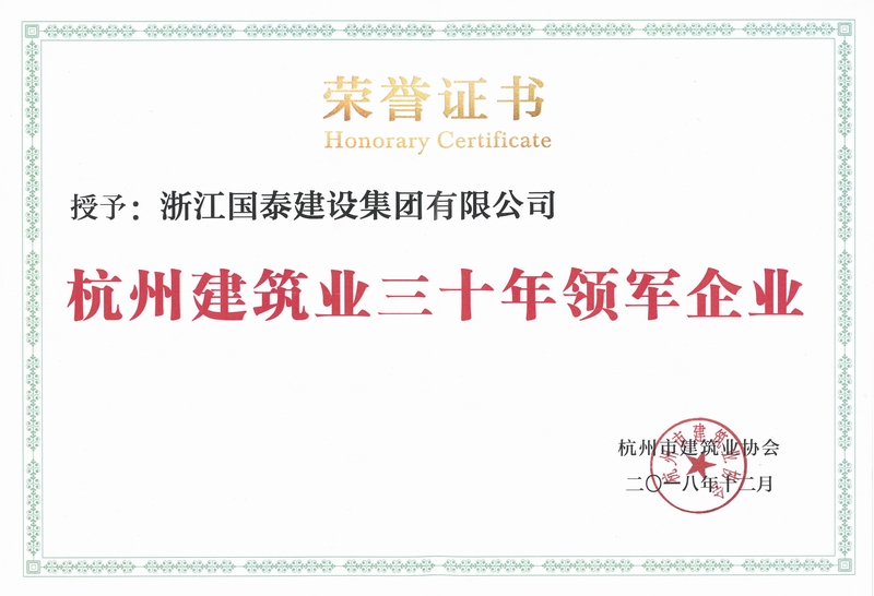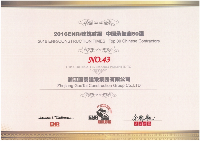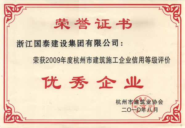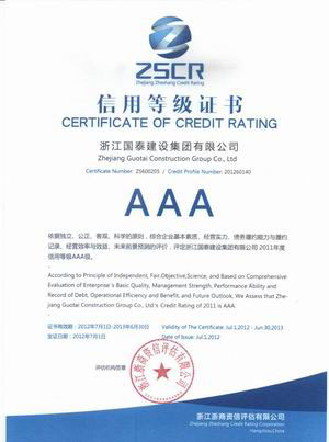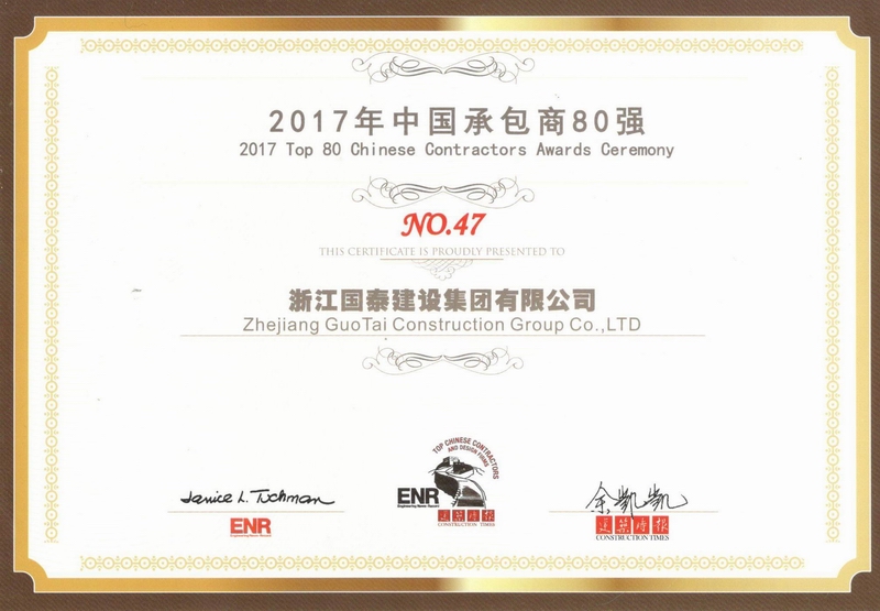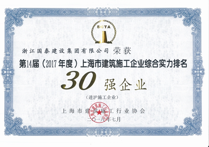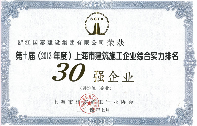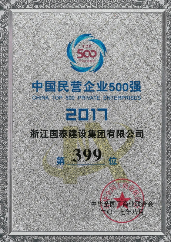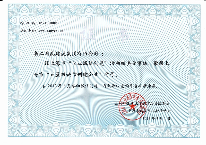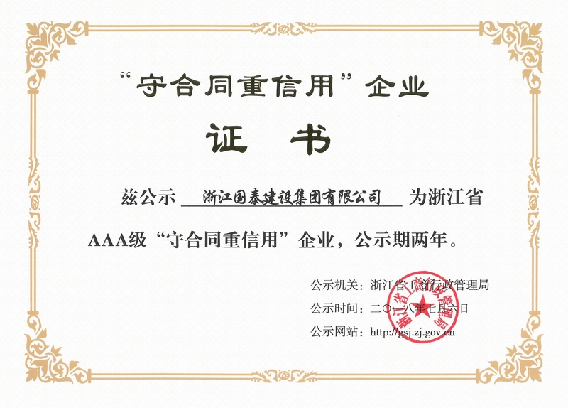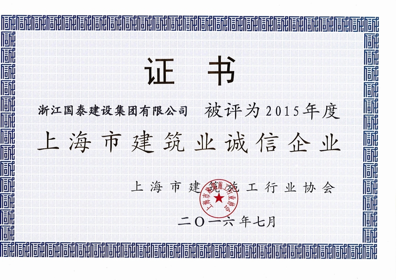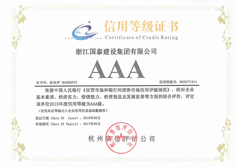 浙江省百强民营企业,浙江省建筑重点骨干企业,浙江省先进建筑施工企业,浙江省用户满意施工企业,浙江省首批诚信企业,杭州市百强企国泰产业、建设银行"AAA" 级信用企业,连续十八年被评为上海市外省市进沪施工企业工程质量、施工安全、经营行为、队伍管理、文明施工和科技进步等实绩综合考评优秀企业。
