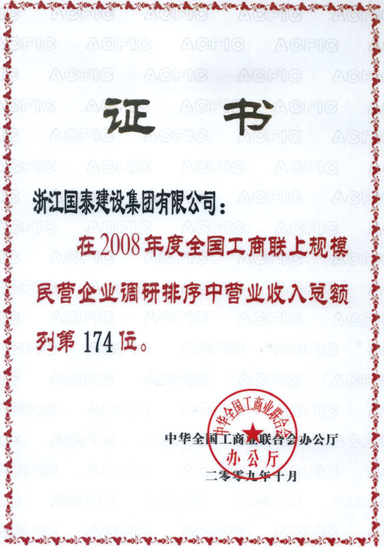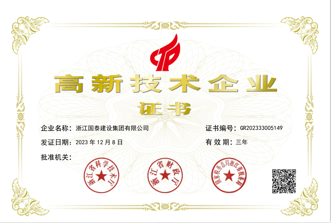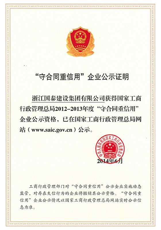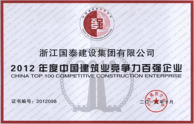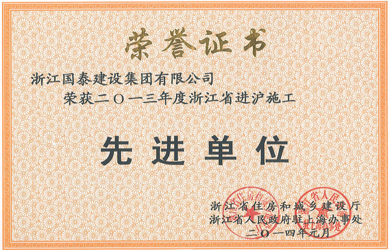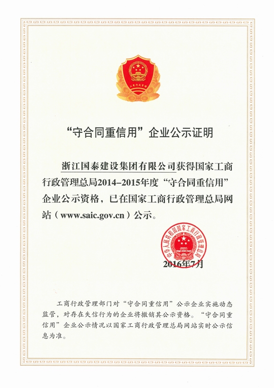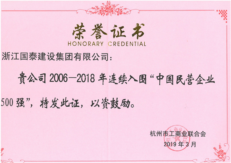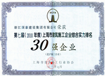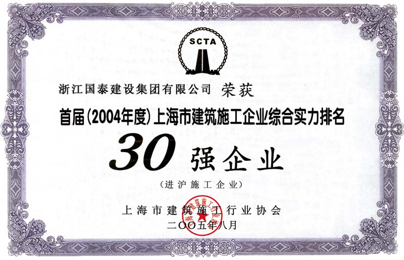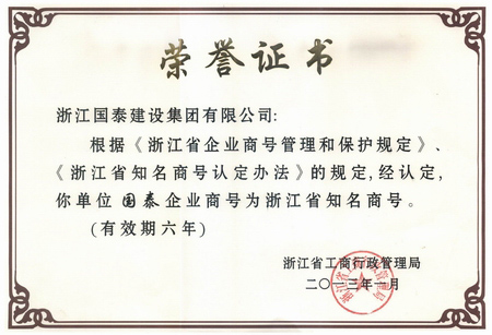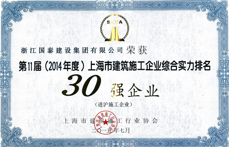 浙江省百强民营企业,浙江省建筑重点骨干企业,浙江省先进建筑施工企业,浙江省用户满意施工企业,浙江省首批诚信企业,杭州市百强企国泰产业、建设银行"AAA" 级信用企业,连续十八年被评为上海市外省市进沪施工企业工程质量、施工安全、经营行为、队伍管理、文明施工和科技进步等实绩综合考评优秀企业。