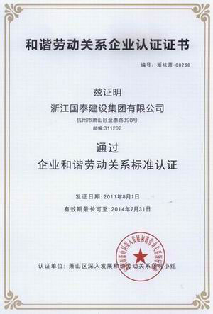 2011和谐劳动关系企业认证证书