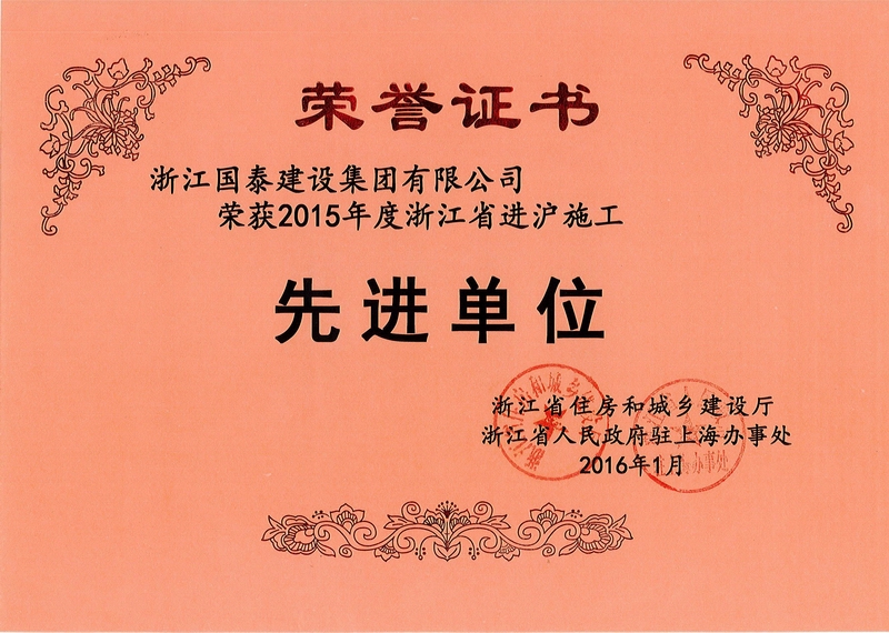 2015年度浙江省进沪施工先进单位