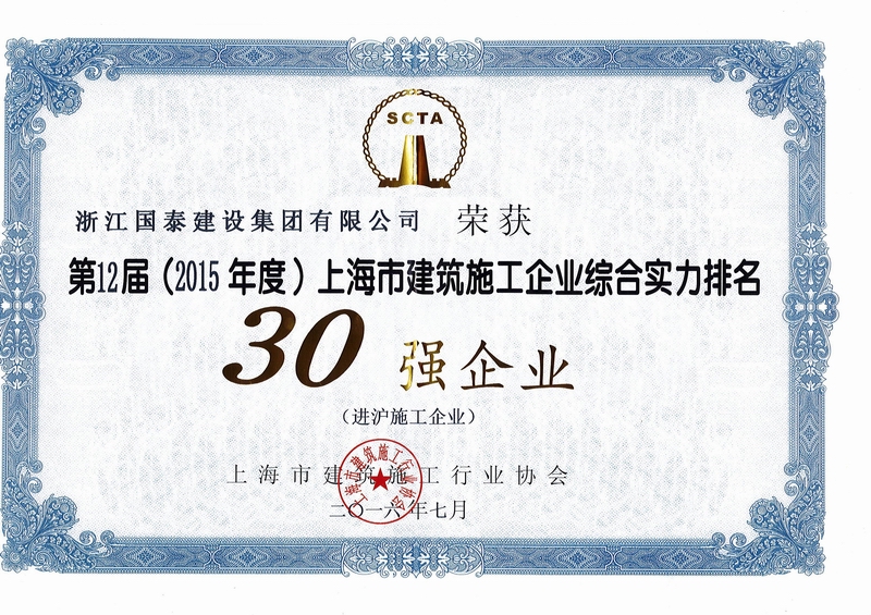 第12届(2015年度)上海市建筑施工企业综合实力排名30强企业