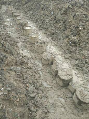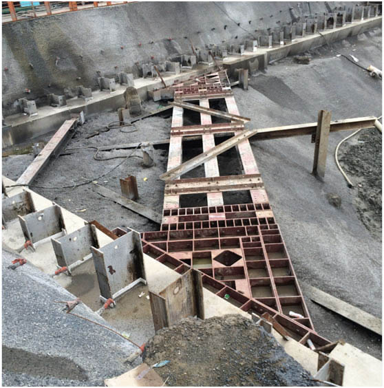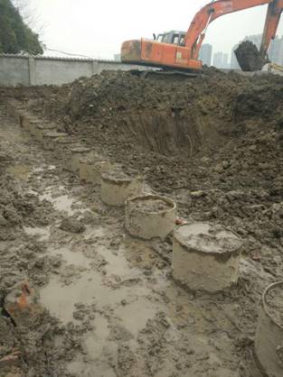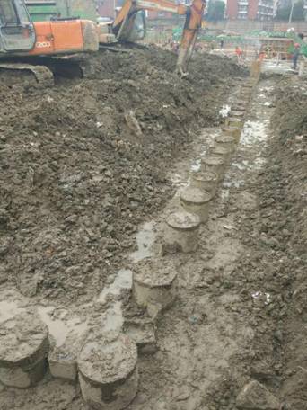 排桩墙支护结构是利用成排灌注桩、预制桩、板桩等类型桩构成的支护结构。支护具有结构刚度大,抗弯强度高、变形相对较小,安全度好,设备简单,施工方便,需要工作场地小,施工噪声低、振动小等优点。萧政储出(2011)45号地块商业金融业、办公项目采用该支护形式(三道内撑式排桩墙围护结构),北干街道畈里张棚户区改造安置房项目(二道内撑式排桩墙围护结构)由于地下水承压水头较高,电梯井坑中坑开挖采用高压旋喷桩满堂加固进行封底,同时设置承压水减压井进行降压,以保证抗突涌稳定满足要求。