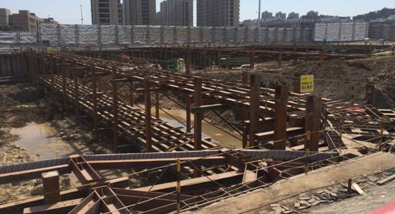在钢管桩的两侧加入了防水锁扣装置,与(拉森)钢板桩自由组合形成多种形式的连续支护结构挡墙,利用钢管桩的刚度大和(拉森)钢板桩的防水性好的特点,两者相结合,配以适当的内部支撑结构或外部拉锚结构,快速形成安全可靠的基坑支护体系。根据土质及地下水的情况,结合适当的降水措施,确保基坑支护结构的安全。余政储出[2016]5号地块商办楼新建项目,应用该技术施工,缩短了施工周期,节约施工成本。